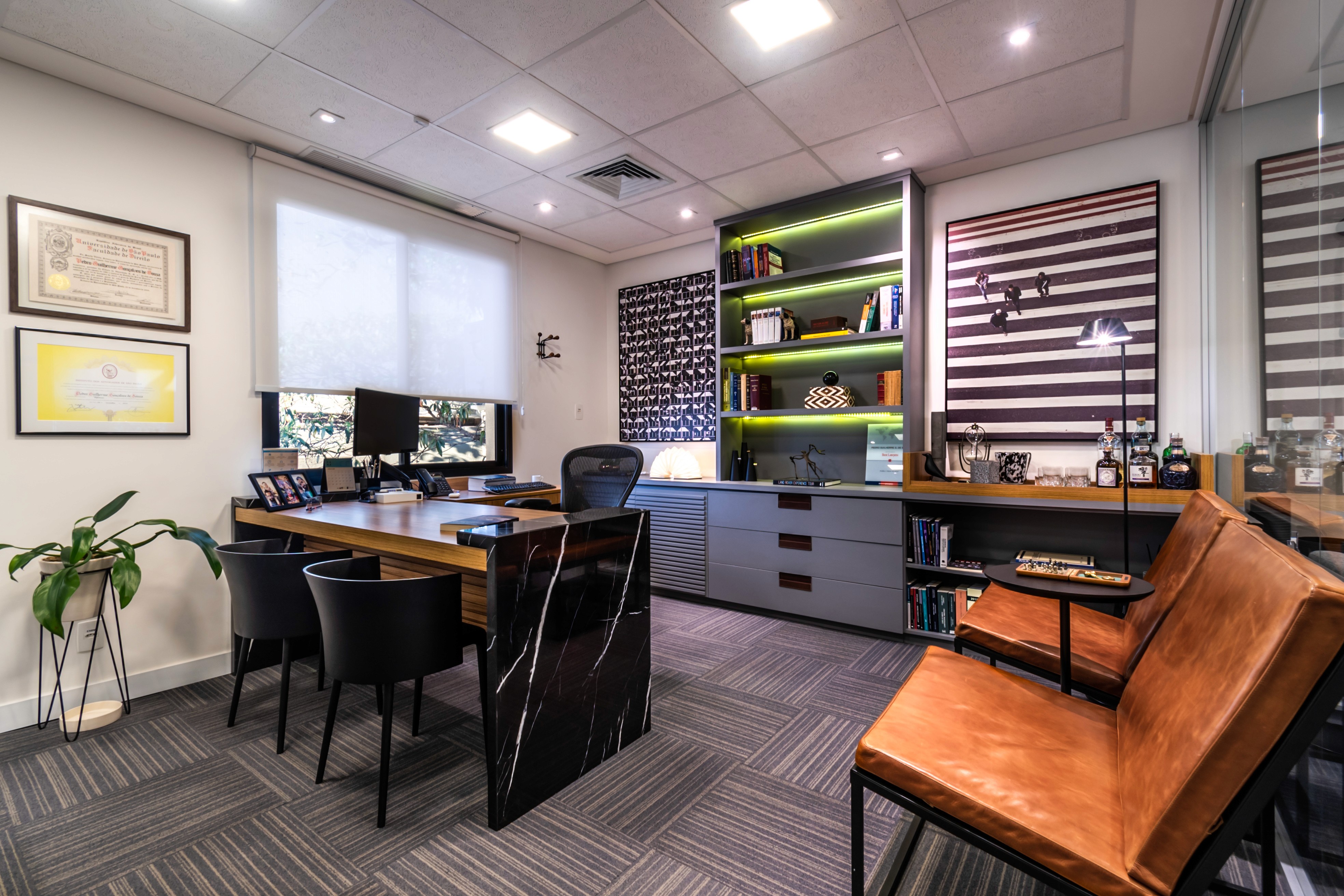 Todas as especialidades foram executadas de forma integrada, resultando em um ambiente corporativo que une funcionalidade, sofisticação e conforto para colaboradores e clientes.